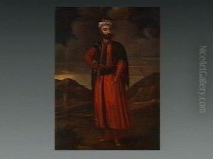 A tronie of a man in ceremonial robes with a gold chain and a hat oil on canvas.