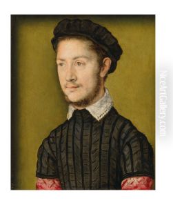 Portrait of a young man, probably an officer royal, small half-length, wearing a black slashed doublet and black cap