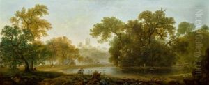 WOODED RIVER LANDSCAPE, WITH A CATHEDRAL BEYOND