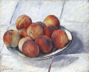 ASSORTED FLOWERS IN A VASE WITH GRAPES AND A PEACH ON A TABLE