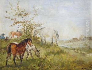 Hirte mit Hund und weidenden Pferden in Landschaft